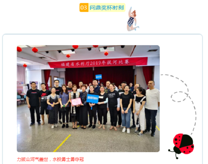 4月26日,集團(tuán)公司參加水利廳直屬機(jī)關(guān)工會(huì)拔河比賽,經(jīng)過三輪激烈的角逐,一路過關(guān)斬將,從15支參賽隊(duì)伍中脫穎而出,勇奪桂冠,這是集團(tuán)公司連續(xù)五年蟬聯(lián)水利廳直屬機(jī)關(guān)工會(huì)拔河冠軍。